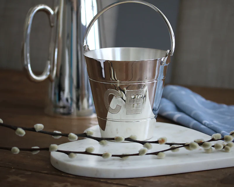 The HÔTEL Silver 'Ice' Pail is a new piece from the Hôtel Private Label Collection. Inspired by vintage pieces made for deluxe European hotels, steamship lines, and fine restaurants. This HÔTEL Silver 'Ice' Pail is handmade and triple-plated in pure silver. The letters are beautifully etched in the silver giving it a cheeky feel.
