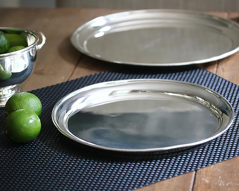 The HÔTEL Silver Round Tray is available in a variety of sizes. They are handy for carrying drinks or serving your favorite hor d'oeuvres. Ina Garten likes to display them standing up in a glass cabinet or an open shelf in the kitchen. This also allows them to be visible and accessible. Like the other pieces in the collection, the HÔTEL Silver Round Tray is designed for everyday use. It's has a thick rolled lip and it's streamlined design makes it a must-have. A vintage piece originally made for deluxe European hotels, steamship lines, and fine restaurants, each HÔTEL Silver Round Tray is triple-plated in pure silver.