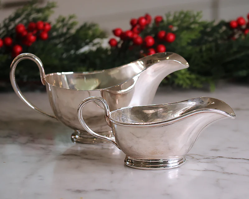 HÔTEL Silver Sauce Boats! We are so excited to add these new HÔTEL vintage pieces to our collection. These vintage silver gravy boats are spectacular and a magnificent example of beauty and class. Designed to be used every day, they make a grand statement on any table or open shelf. Use them for serving créme fraîche, vinaigrettes, hot fudge or caramel sauces, and of course gravies. Available in two sizes.