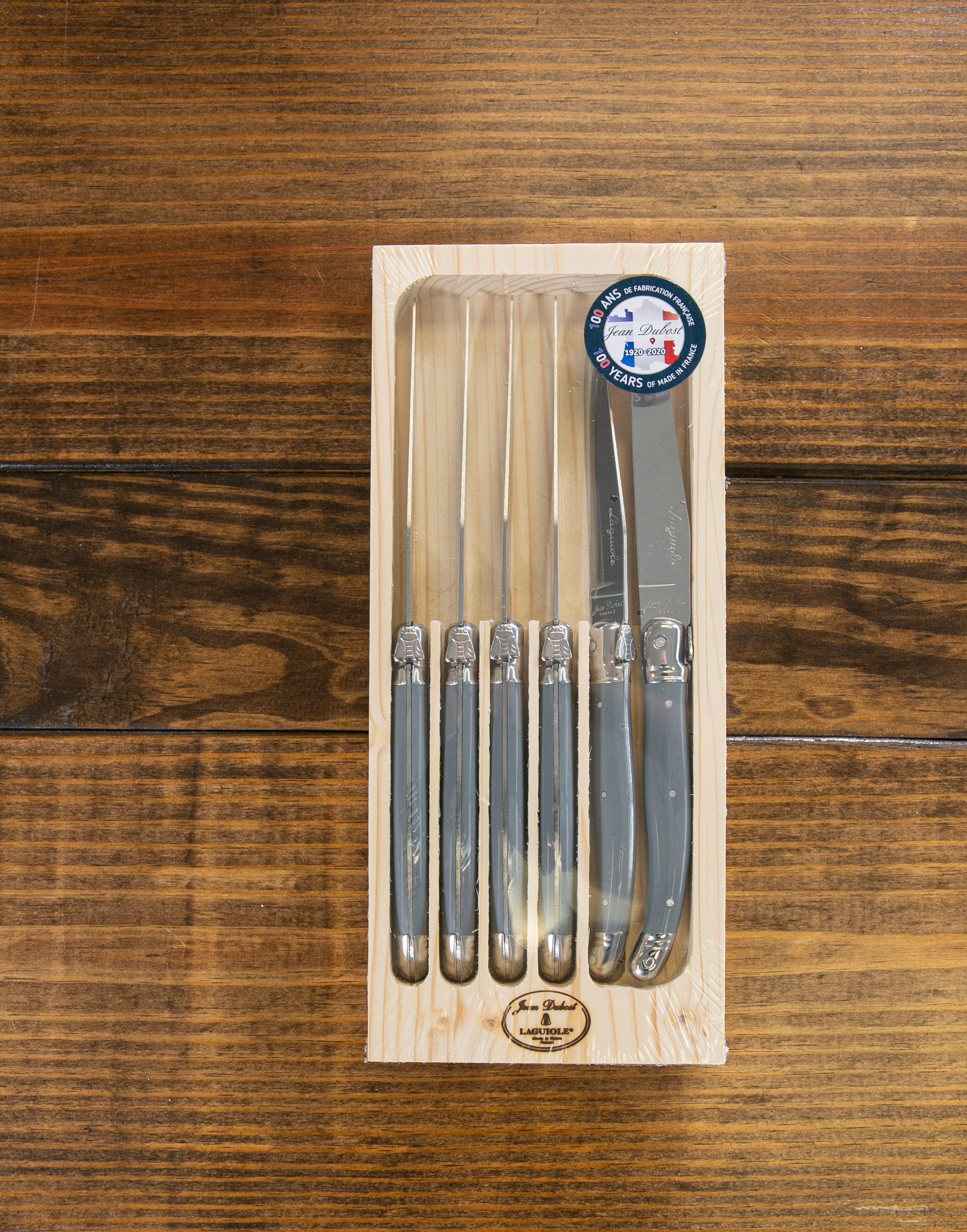 Set the table in style with these chic Laguiole steak knives by Jean Dubost. Each knife in this set has a sharpened blade and a gauge of 1.2mm, and is put through 25 different production stages before it is stamped, polished, and packaged. The knives are rust resistant and are dishwasher safe.
